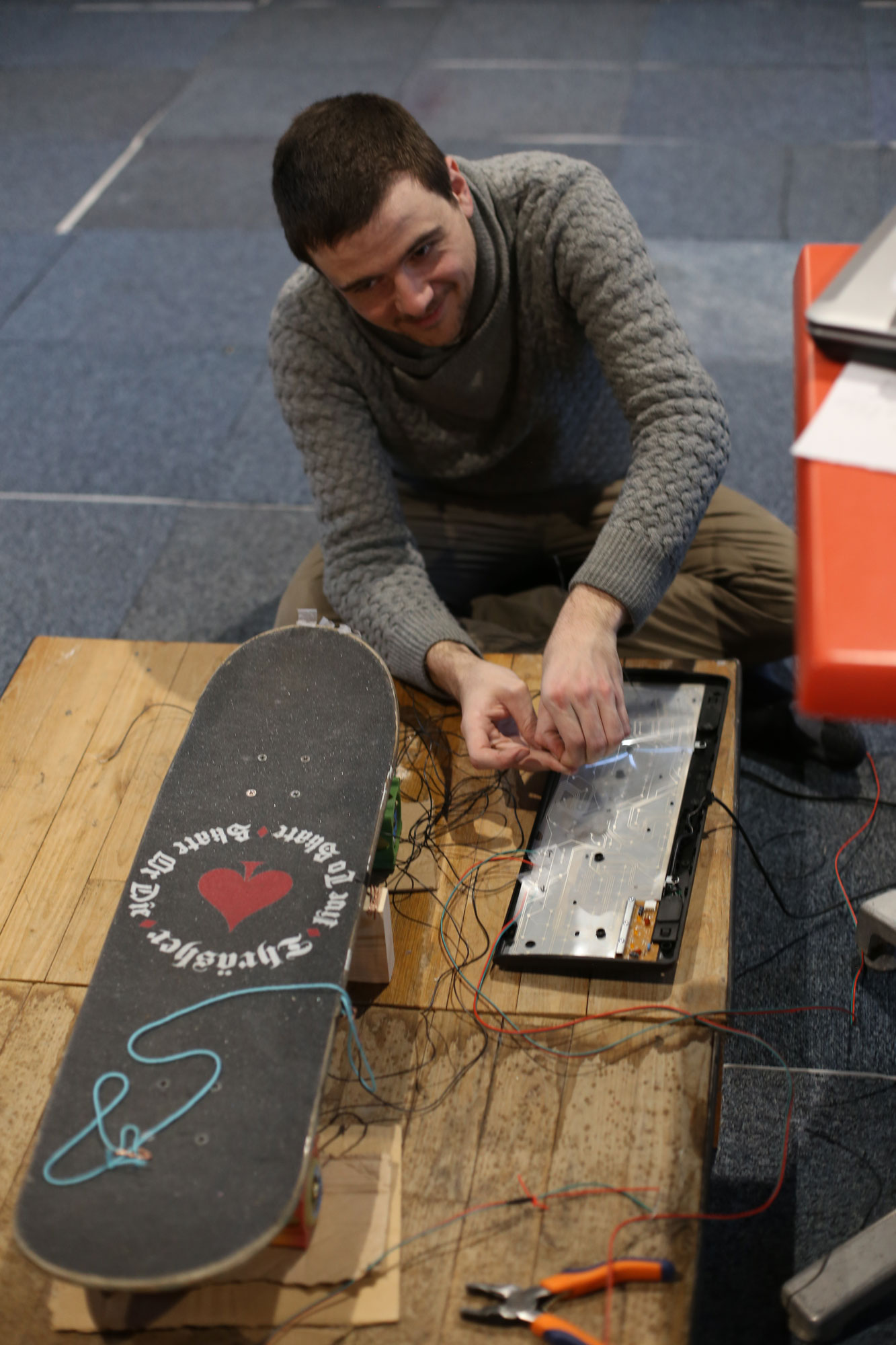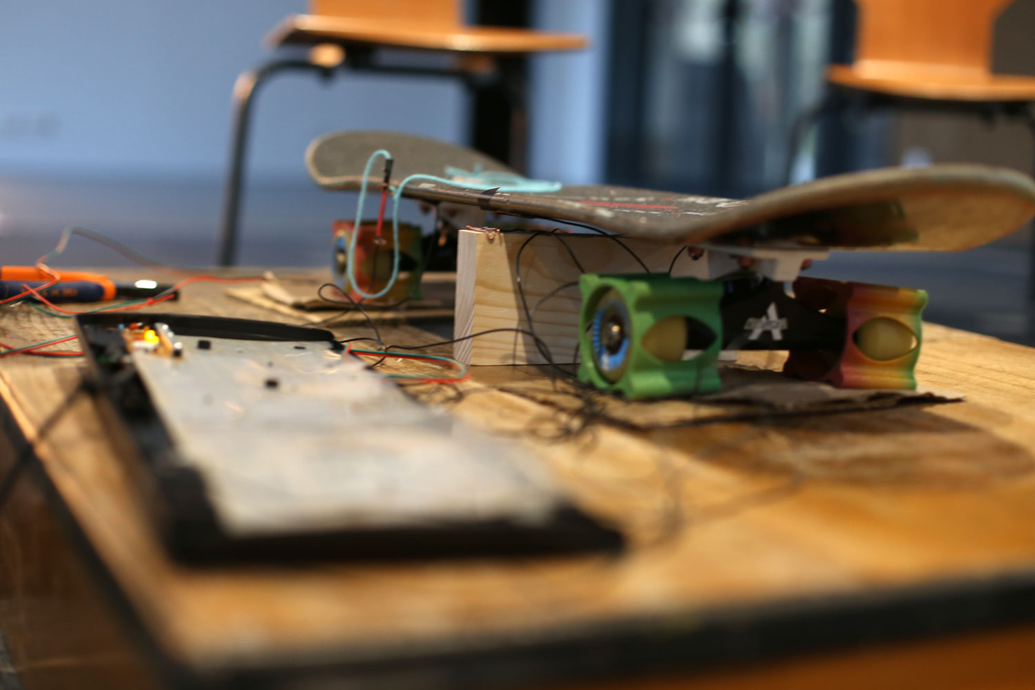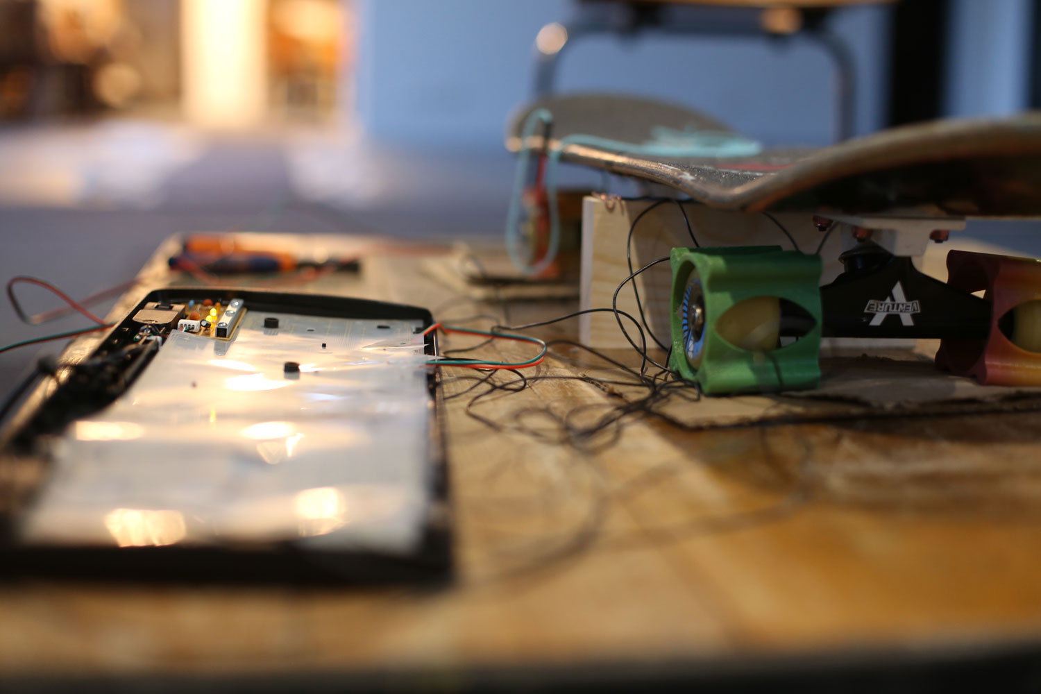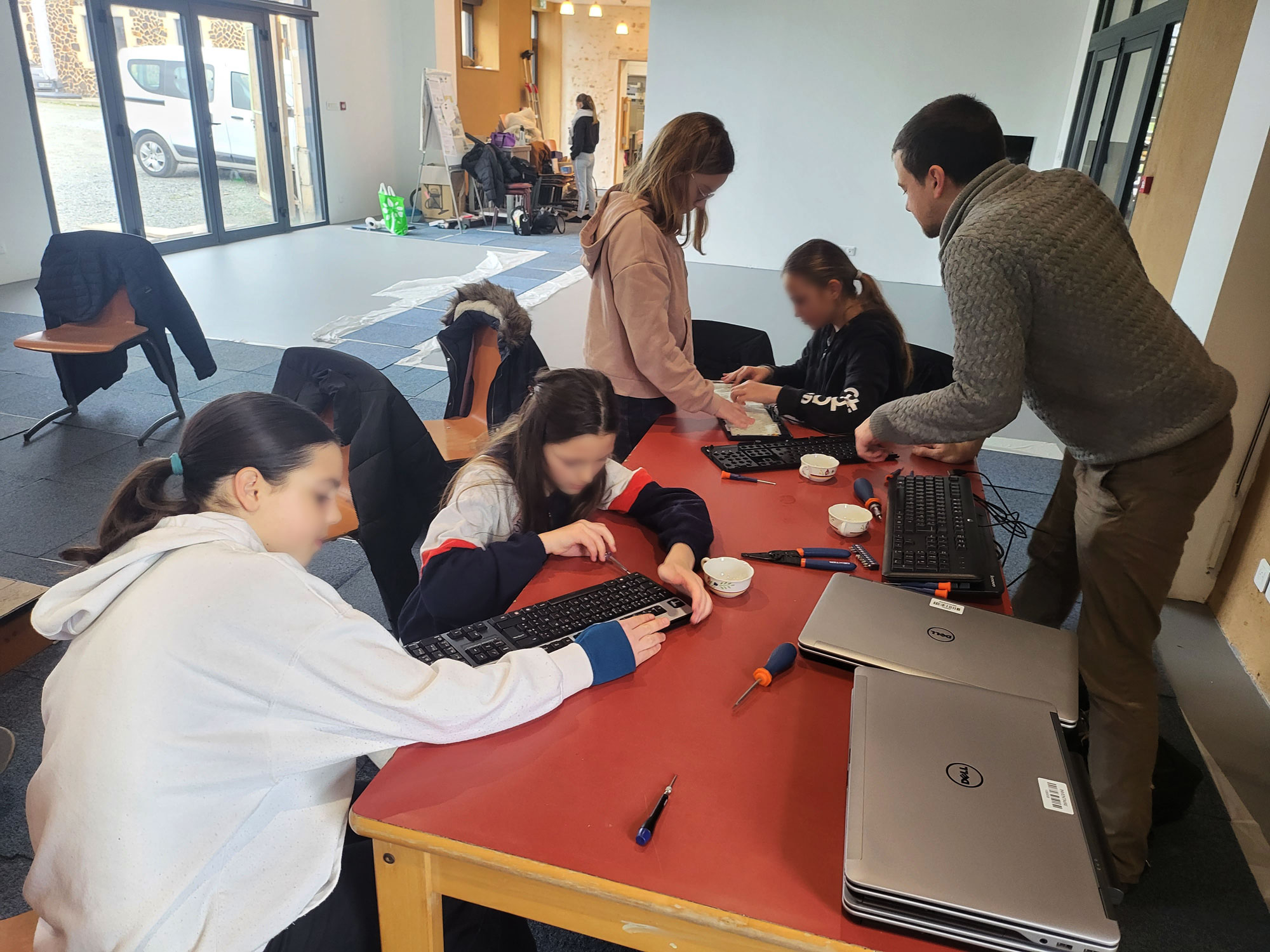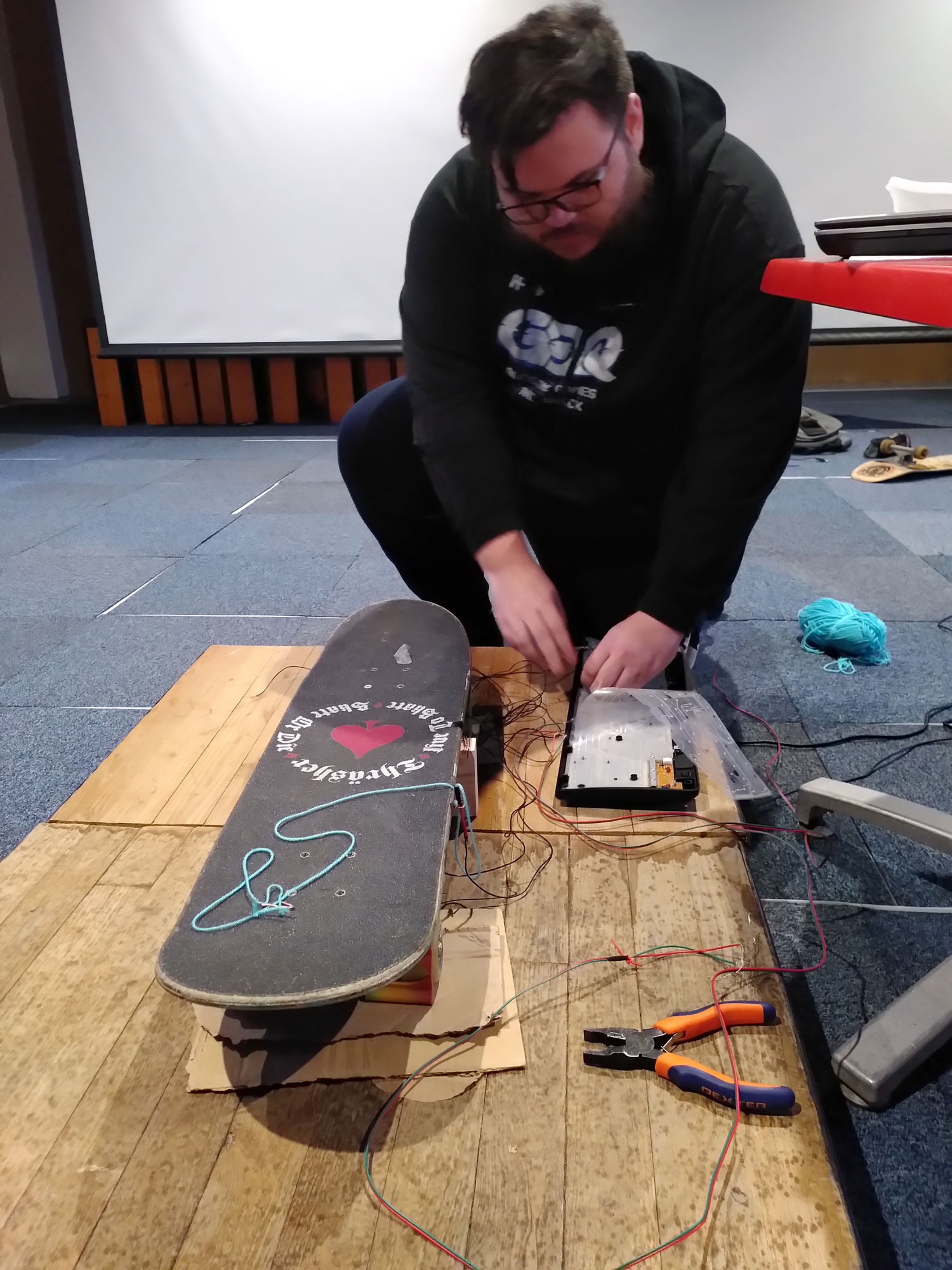 Initialement prévu avec du « Makey Makey« , kit électronique éducatif, l’activité a été encore plus technique par du « hacking » de clavier (en démontant et détournant un clavier) : Grâce à Baptiste Jorant et Pierre-Maxence Huan, qui ont élaboré et conduit l’atelier, les ados ont ainsi pu démonter le clavier d’ordinateur et le relier à une planche de skateboard, pour la transformer en manette de jeu vidéo !