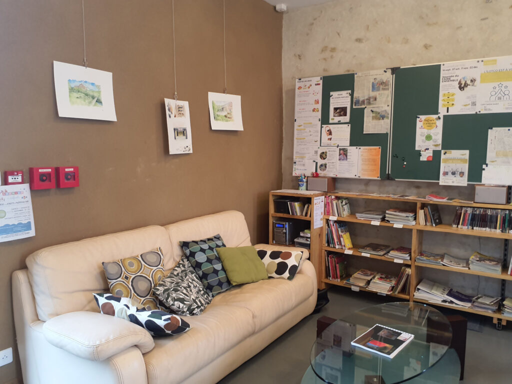 6 aquarelles représentant divers espaces de L’îlotCo sont accrochées au Café-Cantine.