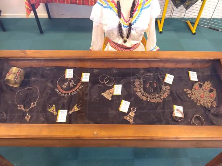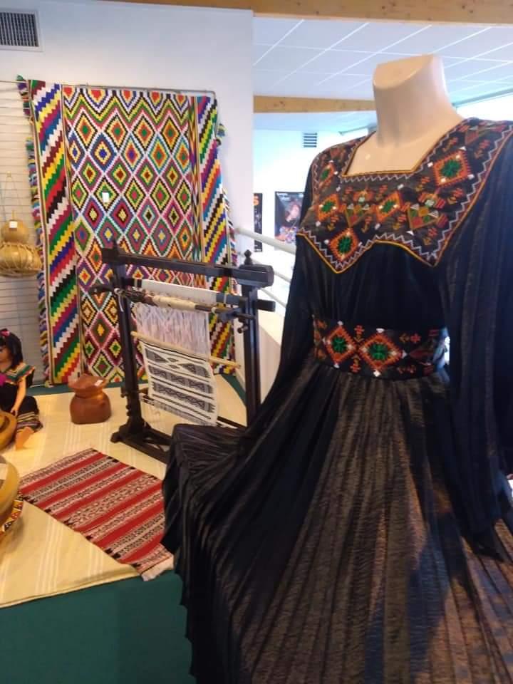 Exposition : bijoux, métier à tisser avec tapis et couvertures, poteries