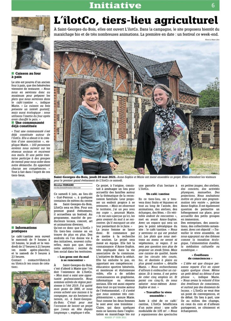 Voir l’article - Le Maine Libre – article du 5 juin 2021 « Animations, fêtes, maraîchage bio : L’îlotCo, un tiers lieu agriculturel »