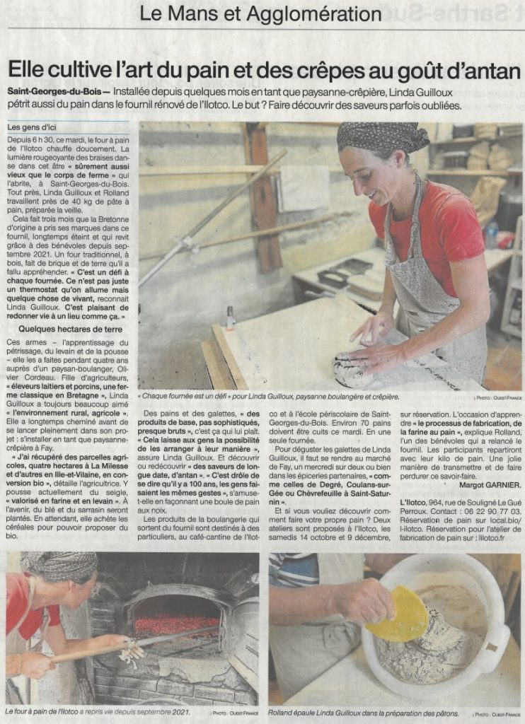 Voir l’article - Maine Libre – 22 août 2023 « Cette paysanne sarthoise cultive l’art du pain et des crêpes au « goût d’antan » »
